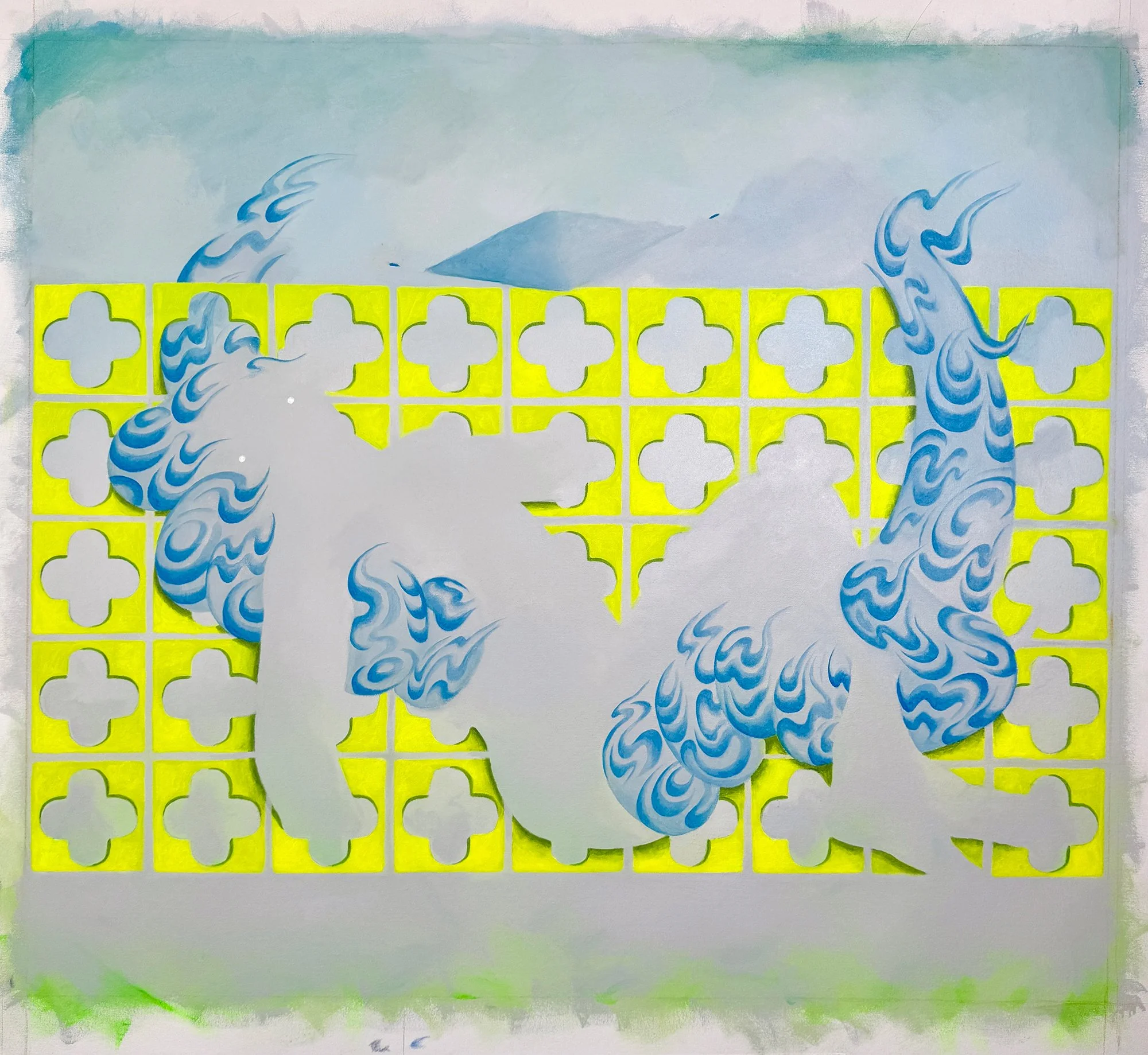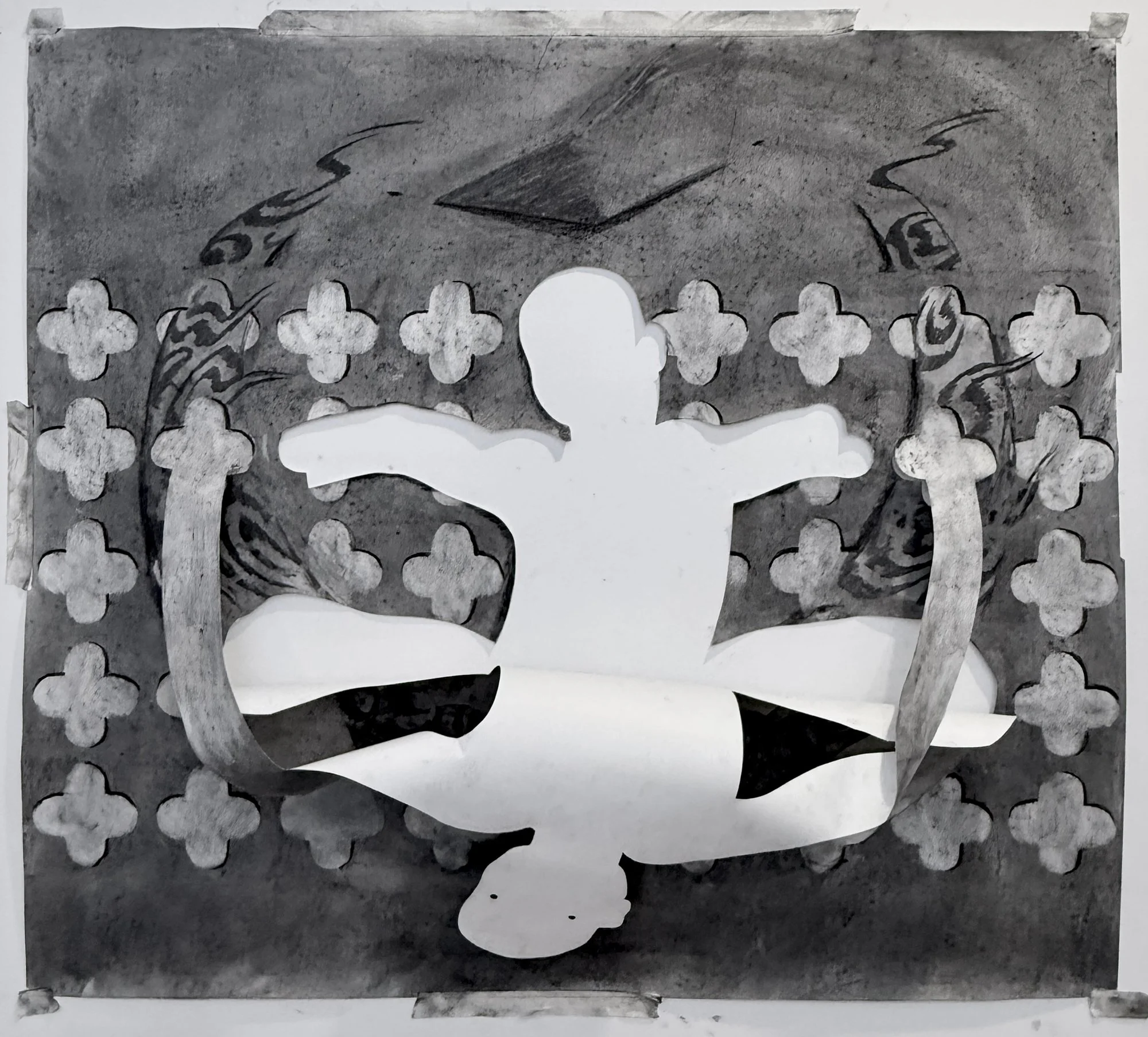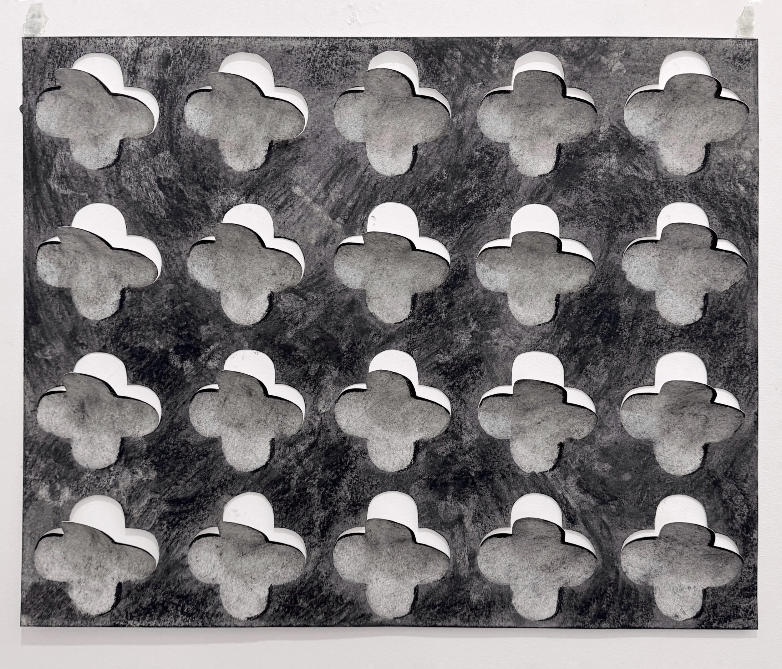 "How do we draw power from holes themselves?" Brett asks. His repeated use of quatrefoil forms (four-lobed shapes found in religious iconography and in breeze blocks) creates visual puzzles about presence and absence. When Brett physically cuts out sections of paper, the "hole" shifts: is it the quatrefoil shape, or the void it creates?