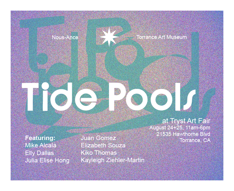 We encounter tidepools between the solid ground of the shore and the depths of the ocean. They are liminal and transitory spaces, not always visible, hosting creatures that adapt to the shifting currents of the sea. Tide Pools is a show about summer, discovery, changing ecosystems, and wonder. The artists included channel processes of flow and experimentation; boundaries between drawing, painting, sculpture, and craft are fluid and permeable in their hands. They are resourceful and inventive with material, trusting intuition yet remaining careful with form. We see in them a unique and beautiful adaptability, much like the creatures in the tidepools, to the shifting environments of the greater Los Angeles Area and are pleased to present their work as part of Tryst at the Torrance Art Museum.